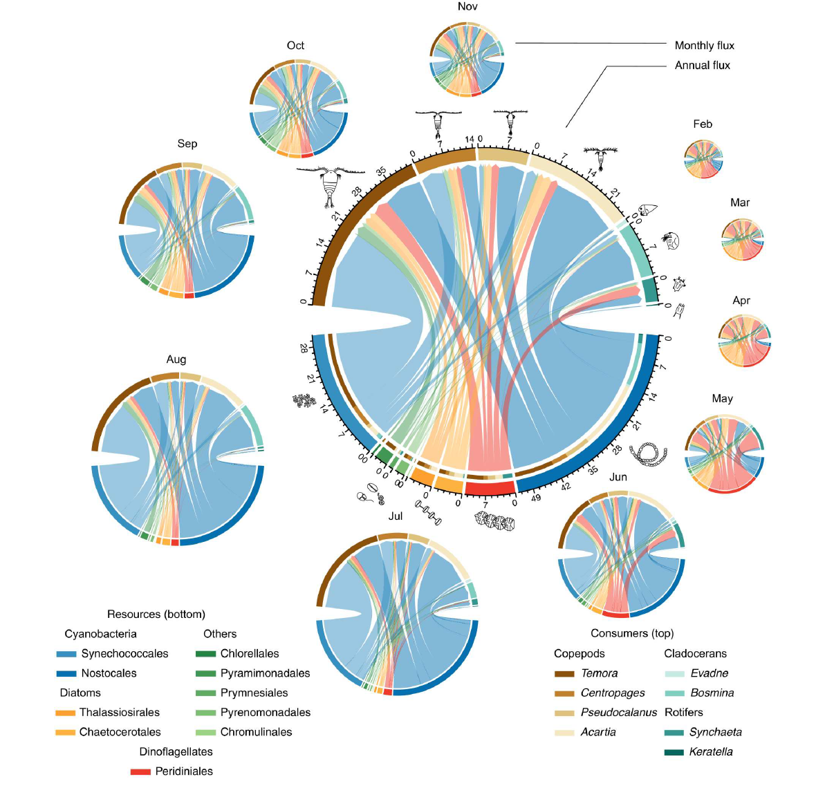 consumers (zooplankton, top). The width of the nodes (taxa) corresponds to each population’s contribution to annual secondary production. The diameter of each plot is proportional to the square root of the total production.
